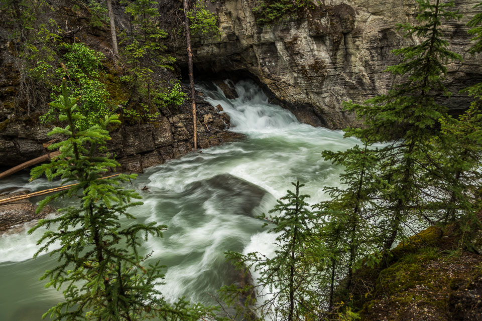 Flowing out of Medicine Lake, the Maligne River flows about 15 kilometers upstream as a full size river, but very quickly disappears into seeps in the ground and completely vanishes from the surface not far from the lake for most of the year. The smaller streams that feed the valley below that point rebuild the river by the time it reaches the top of the canyon. As the river drops down into the canyon it intersects the bedrock layers where the underground waters flow. Numerous large underground streams join and greatly increase the flow.