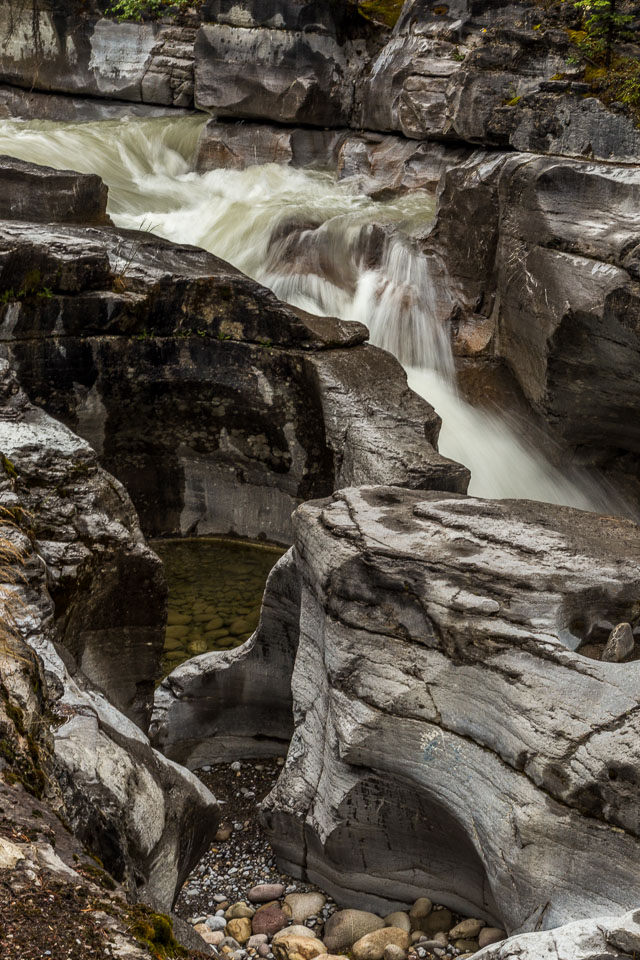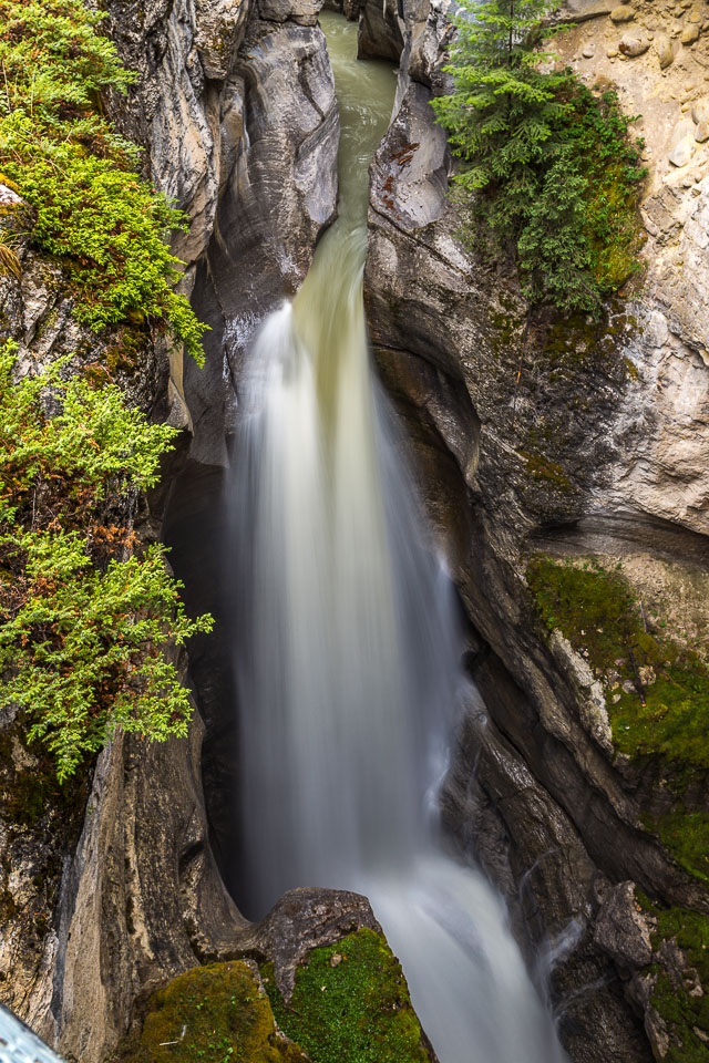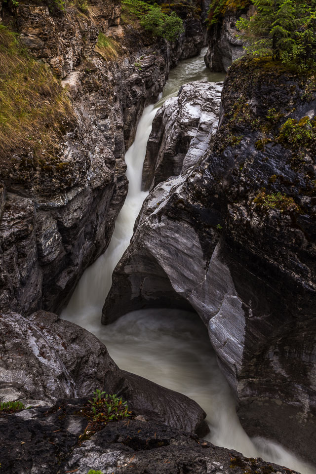 The Maligne River ('maligne' is french for 'malignant' due to the difficulty of crossing) has carved itself the deepest slot canyon in the Canadian Rockies.