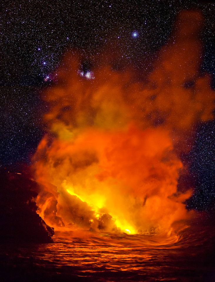 Images of lava; earth air fire and water. From the Kalapana subdivisions area, Kalapana bay ocean entry (a night hike over and active lava tube to then see the lave we walked over entering the sea) and the Halemaʻumaʻu lava pool at he Kīlauea summit