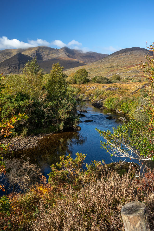 The Gap of Dunloe (from Irish: Dún Lóich, meaning "Lóich's stronghold", otherwise known as Bearna an Choimín meaning "gap of the common-land") is a narrow mountain pass in County Kerry, Ireland. The pass is located between the mountain ranges of the MacGillycuddy's Reeks (to the west) and the Purple Mountain Group (to the east). The road through The Gap, from Kate Kearney's Cottage down to Lord Brandon's Cottage, is about 11 kilometres (7 miles) in length, climbing and descending about 200 metres (650 feet) in total elevation change. Within the Gap are five lakes: Coosaun Lough, Black Lake, Cushnavally Lake, Auger Lake, and Black Lough (north to south). These lakes are connected by the River Loe. Between the first two lakes is an old arch bridge called the Wishing Bridge so named because it is said that wishes made while upon it are destined to come true.