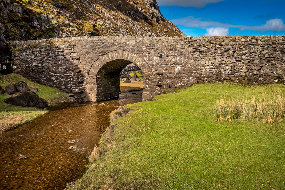 The Gap of Dunloe (from Irish: Dún Lóich, meaning "Lóich's stronghold", otherwise known as Bearna an Choimín meaning "gap of the common-land") is a narrow mountain pass in County Kerry, Ireland. The pass is located between the mountain ranges of the MacGillycuddy's Reeks (to the west) and the Purple Mountain Group (to the east). The road through The Gap, from Kate Kearney's Cottage down to Lord Brandon's Cottage, is about 11 kilometres (7 miles) in length, climbing and descending about 200 metres (650 feet) in total elevation change. Within the Gap are five lakes: Coosaun Lough, Black Lake, Cushnavally Lake, Auger Lake, and Black Lough (north to south). These lakes are connected by the River Loe. Between the first two lakes is an old arch bridge called the Wishing Bridge so named because it is said that wishes made while upon it are destined to come true.