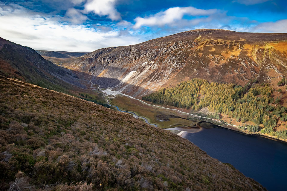 The trail we took (The Spinc trail, the white dots on this map ) climbs up and around the upper lake. The trail first goes though the ruins of Reefert church then climbs steeply up by the Poulanass Waterfall before joining a boardwalk. More than 600 wooden steps lead you to a viewing point overlooking the Upper Lake. A 3 mike long boardwalk skirts the top of the cliffs before descending through blanket bog and heath into the picturesque Glenealo Valley, home to a large herd of deer. A rough track then leads you back down into Glendalough Valley.