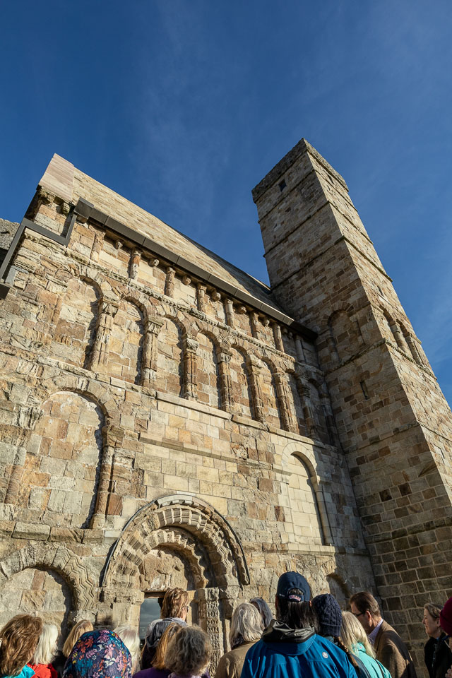 Cormac's Chapel, the chapel of King Cormac Mac Carthaigh, was begun in 1127 and consecrated in 1134. It is a sophisticated structure, with vaulted ceilings and wide arches, drawing on contemporary European architecture and infusing unique native elements. The Irish Abbot of Regensburg, Dirmicius of Regensburg, sent two of his carpenters to help in the work and the twin towers on either side of the junction of the nave and chancel are strongly suggestive of their Germanic influence, as this feature is otherwise unknown in Ireland. Other notable features of the building include interior and exterior arcading, a barrel-vaulted roof, a carved tympanum over both doorways, the magnificent north doorway and chancel arch. It contains one of the best-preserved Irish frescoes from this time period. The Chapel was constructed primarily of sandstone which has become waterlogged over the centuries, significantly damaging the interior frescoes. Restoration and preservation required the chapel be completely enclosed in a rain-proof structure with interior dehumidifiers to dry out the stone. It has been completely cleaned and restored.
